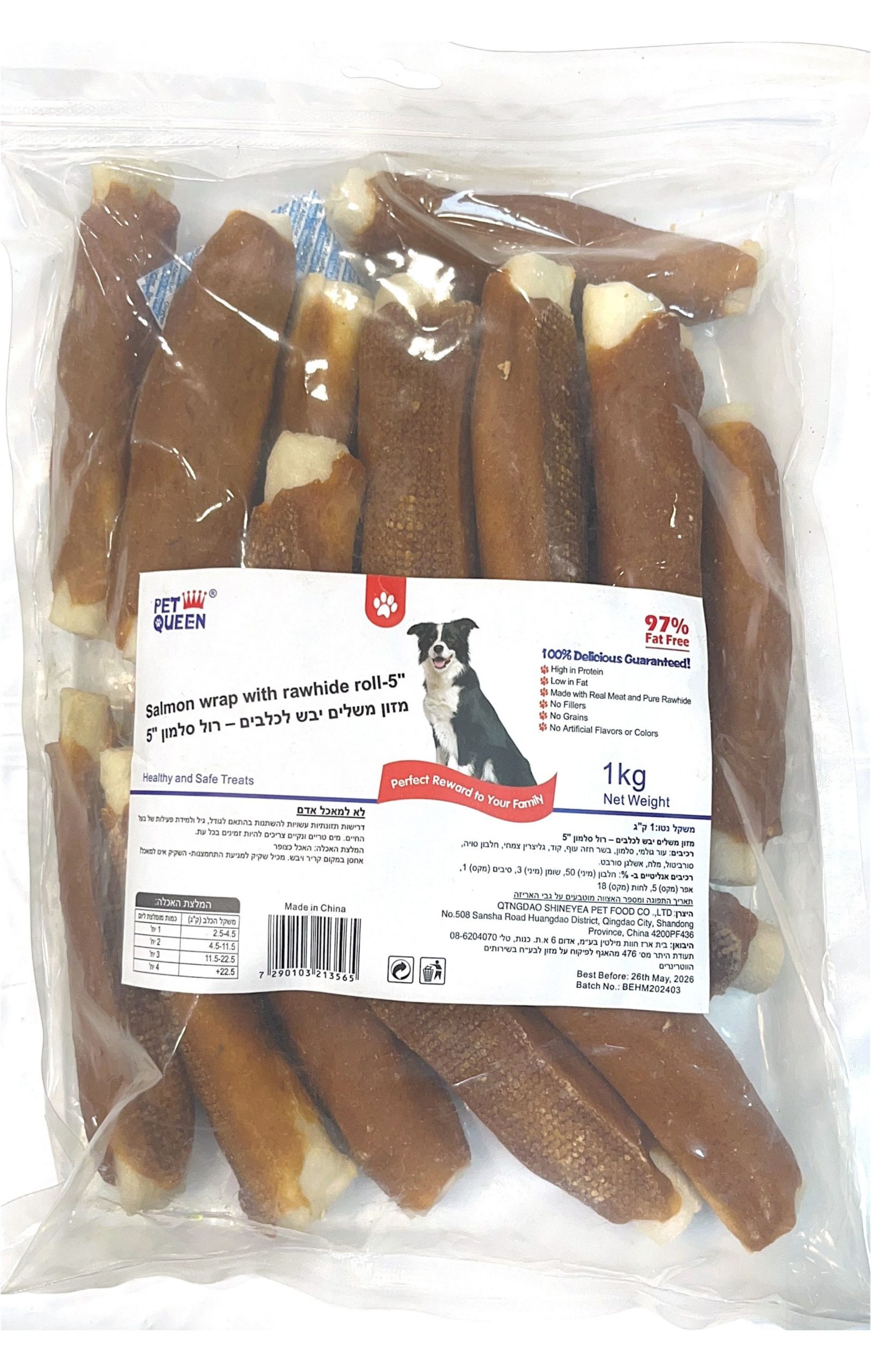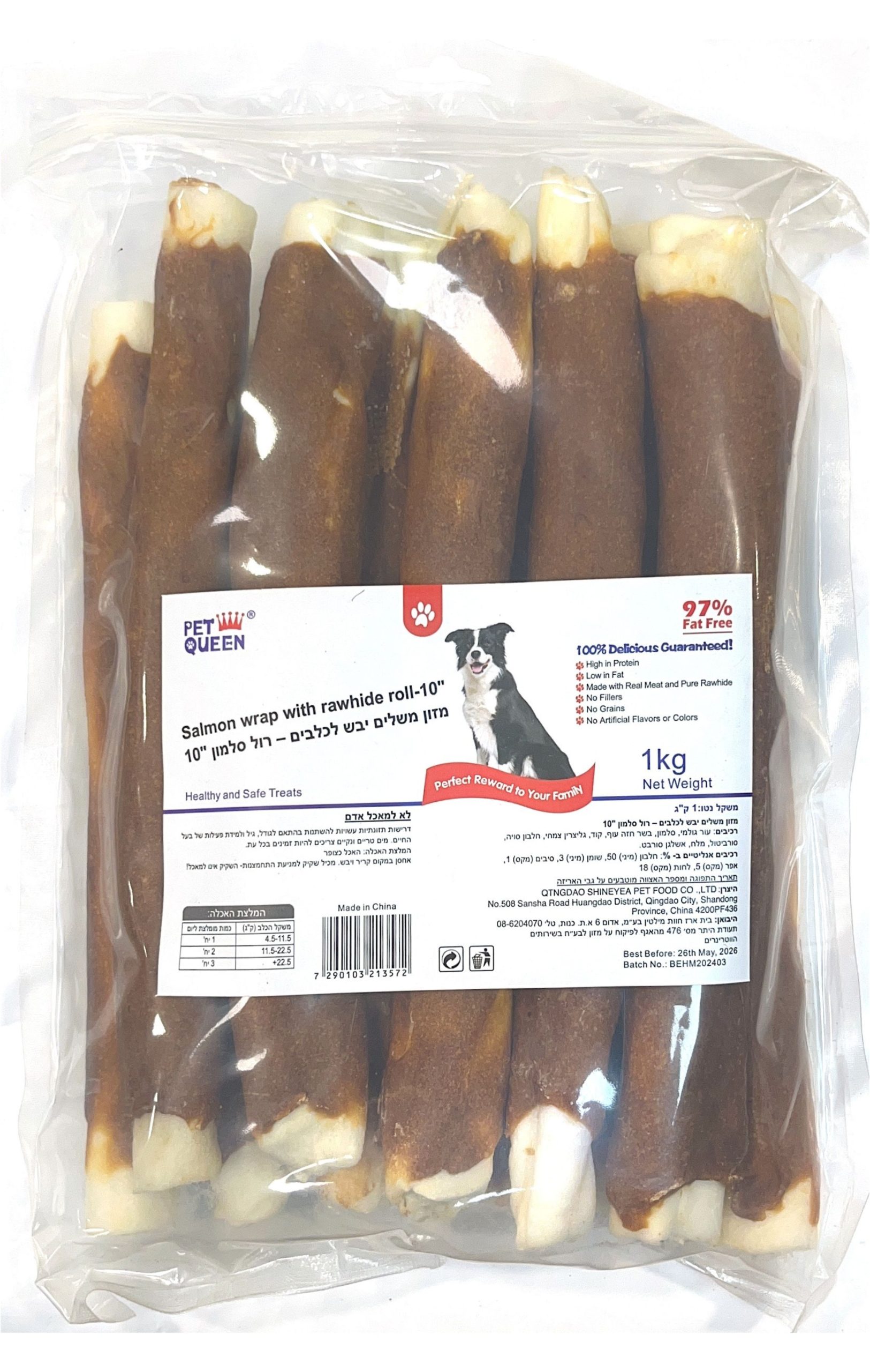 פטקווין עצם לעיסה לכלב – מקל עור בציפוי בקר/סלמון 25 ס"מ – 1 ק"ג Pet Queen